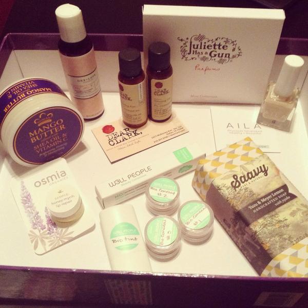After my green celebrity sighting, Brandie and I found a cozy little bench. We then started to explore the goodie bags, which were generously offered to the first 150 R.S.V.P. guests. What we found were awesome full and sample sizes of products. It was like opening presents on Christmas morning..